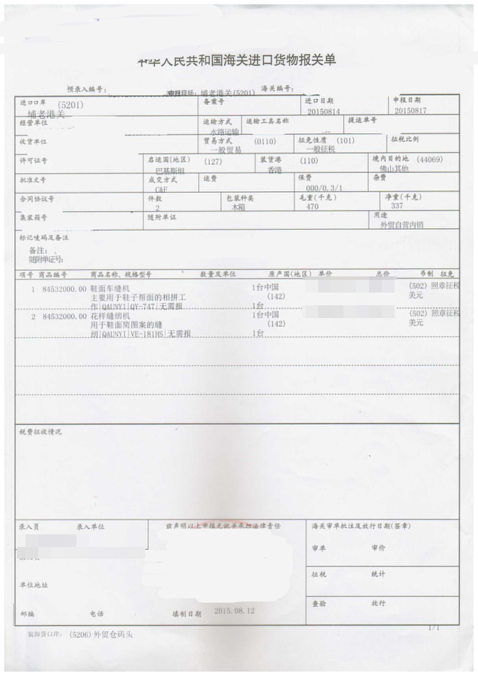 進口日期:20150814客戶:佛山市某鞋機有限公司