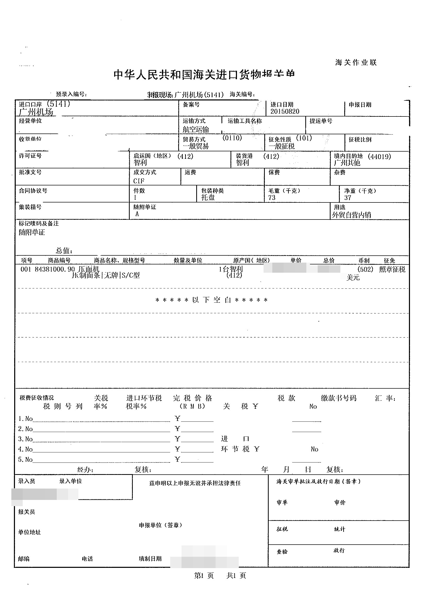 進(jìn)口日期:20150820
