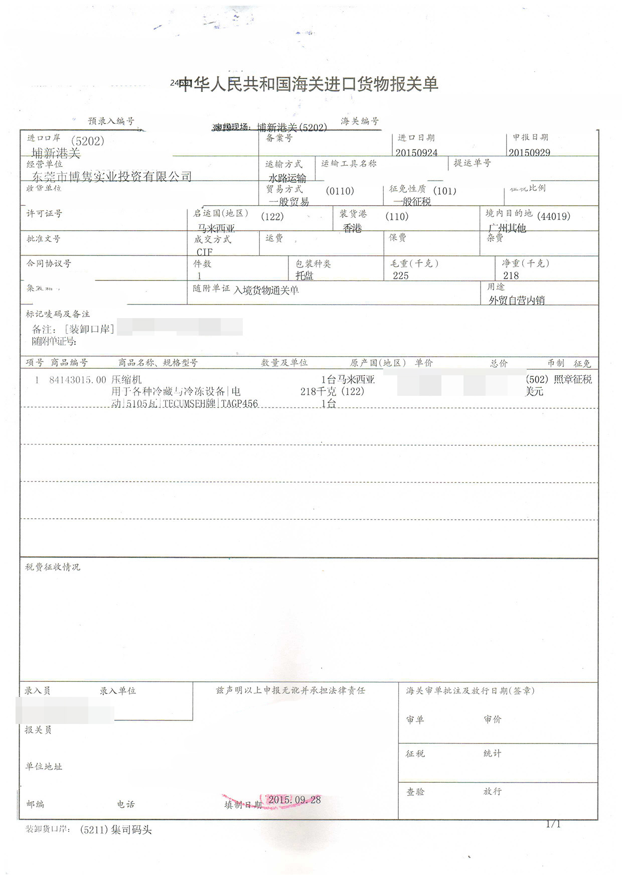三、壓縮機進口報關案例展示